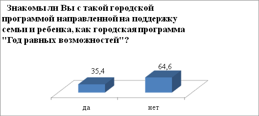 Городская программа «Год равных возможностей», направленная на поддержку инвалидов, является более известной по сравнению с программой «Молодёжь Москвы». О программе «Год равных возможностей» информированы 35,4% москвичей, принимавших участие в исследовании. Данный результат также следует признать хорошим, особенно учитывая тот факт, что программа ориентирована на определённый сегмент общества.