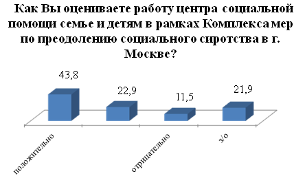 При оценке работы Центров социальной помощи семье и детям в рамках Комплекса мер по преодолению социального сиротства в г. Москве затруднилось с ответом значительно меньше респондентов (21,9%), что вдвое ниже, чем в предыдущих вопросах.