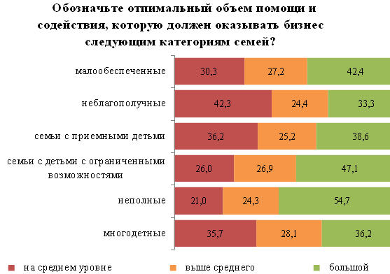 Жители столицы полагают, что бизнес должен оказывать большой объём помощи семьям перечисленных категорий. Наибольшая потребность в подобной помощи респондентам видится по отношению к неполным семьям (свыше 40% респондентов выбрали вариант ответа «большой объём помощи»). В то же время, применительно к неблагополучным семьям лишь 19,2% респондентов выбрали данный вариант ответа, что свидетельствует о нецелесообразности, с точки зрения участвовавших в опросе граждан, помогать данной группе московских семей материально.