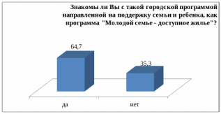 Городская программа «Молодой семье – доступное жильё» является наиболее известной среди всех остальных. Большинство респондентов (64,7%) знают о её существовании. Данное обстоятельство свидетельствует об эффективности мероприятий, реализуемых в рамках данной программы, даже не смотря на то, что она ориентирована на молодёжь. Следует подчеркнуть, что хорошая известность данной программы положительно влияет на имидж Правительства Москвы в целом.