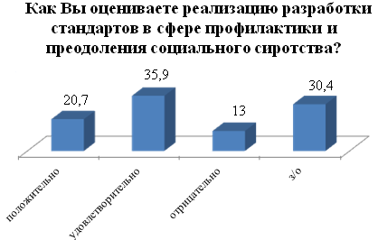 К разработке стандартов в сфере профилактики и преодоления социального сиротства среди москвичей преобладает скорее положительное отношение. 35,9% участников опроса оценивает удовлетворительно разработку стандартов в сфере профилактики и преодоления социального сиротства.
