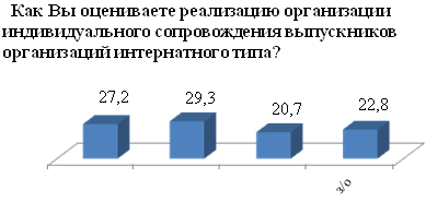 Мнения респондентов по поводу оценки организации индивидуального сопровождения выпускников организаций интернатного типа разделились примерно поровну между всеми предложенными вариантами. Несколько более популярным оказалась удовлетворительная оценка (29,3%). Отрицательно к реализации данного направления относится 20,7% респондентов (по-видимому, из опасений возможных злоупотреблений со стороны «сопровождающих»). Затруднилось оценить своё отношение к названному направлению работы 22,8% москвичей.