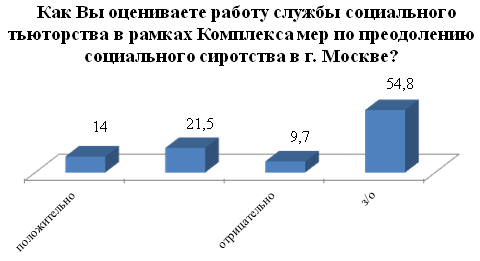 Социальное тьюторство является самой неизвестной программой в рамках Комплекса мер по преодолению социального сиротства в г. Москве. 54,8% респондентов затруднились при ответе на поставленный вопрос. Положительно работу службы социального тьюторства оценили только 14% участников исследования. 21,5% респондентов оценили работу данного института удовлетворительно.