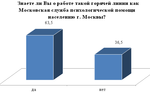Больше половину участников опроса информированы о работе горячей линии Московской службы психологической помощи населению г. Москвы. 63,5% респондентов знают о её существовании, что, безусловно, является положительным результатом функционирования данного института и показателем его значимости для населения столицы.