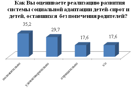 Развитие системы социальной адаптации детей-сирот и детей, оставшихся без попечения родителей, положительно оценивает 35,2% респондентов. Данный вариант ответа является наиболее популярным в данном вопросе. Также 29,7% граждан удовлетворительно относится к развитию данной системы. Отметим также равные группы тех, отрицательно оценивает развитие данной системы, и затруднившихся ответить на поставленный вопрос.