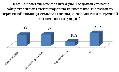Самая большая группа респондентов затруднилась при оценке своего отношения к реализации создания службы общественных инспекторов по выявлению и оказанию первичной помощи семьям и детям, оказавшимся в трудной жизненной ситуации (32,3%). Вероятно, высокий процент затруднившихся с ответом на поставленный вопрос, связан с недостатком информации у населения о создании такой службы. Положительно к данной инициативе относится 28% респондентов, отрицательно – втрое меньшая группа (10,8).