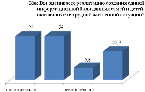 Преобладающая часть респондентов положительно оценивает создание единой информационной базы данных семей и детей, оказавшихся в трудной жизненной ситуации. В сумме 68% участников опроса положительно либо удовлетворительно относится к созданию данной системы. Отрицательно к данному институту относится примерно один из десяти респондентов (9,6%).