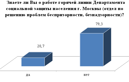 О работе горячей линии Департамента социальной защиты населения г. Москвы знает только 20,7% респондентов. Можно сделать вывод о том, что о работе горячей линии Департамента молодёжной и семейной политики население более информировано по сравнению с аналогичной программой Департамента социальной защиты населения.