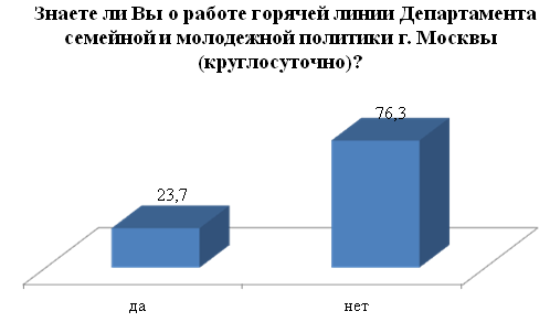 О работе горячей линии Департамента семейной и молодёжной политики знает меньшее число респондентов, по сравнению с телефонами горячих линий, рассмотренных выше. 23,7% участников опроса знают о работе горячей линии Департамента семейной и молодёжной политики г. Москвы. 76,3% респондентов не знают об этом, что отчасти может быть вызвано тем, что далеко не все граждане испытывают потребность в получении подобной помощи.
