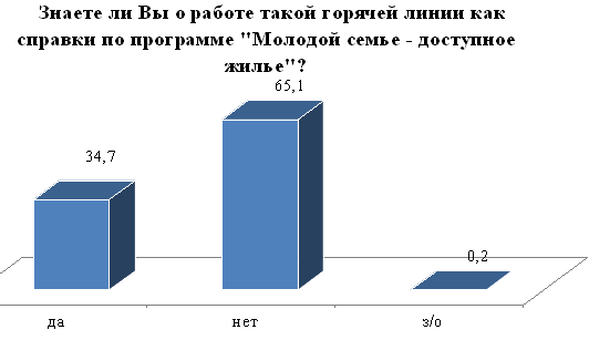 О работе горячей линии - справки по программе «Молодой семье – доступное жильё» информировано 34,7% респондентов. Относительно высокий уровень информированности москвичей о работе данной горячей линии обусловлен популярностью и известностью самой программы «Молодой семье – доступное жильё», подтверждение чего было представлено выше на соответствующей диаграмме, посвящённой этой программе.