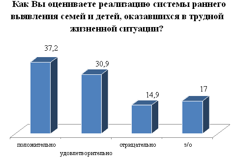 Внедрение системы раннего выявления семей и детей, оказавшихся в трудной жизненной ситуации, положительно оценили 37,2% респондентов. Около трети всех участников опроса оценили (30,9%) удовлетворительно реализацию этой подпрограммы. Затруднилась при ответе на поставленный вопрос значительно меньшая группа участников исследования (17%), чем в предыдущих случаях.