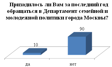 Согласно результатам исследования, каждый десятый респондент за последний год обращался в Департамент семейной и молодёжной политики города Москвы. Полученные результаты свидетельствуют о высокой актуальности работы Департамента и его значения для жителей столицы.
