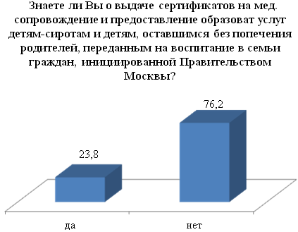 Примерно каждый четвёртый респондент (23,8%) знает о том, что Правительство Москвы инициировало выдачу сертификатов на медицинское сопровождение и предоставление образовательных услуг детям-сиротам и детям, оставшимся без попечения родителей, переданным на воспитание в семьи граждан. Учитывая тот факт, что не самая большая часть общества сталкивается с социально незащищёнными детьми и информацией об их льготах и той помощи, которая оказывается данной категории со стороны Правительства Москвы, полученные результаты следует признать положительными.