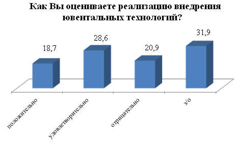 Мнение респондентов по поводу внедрения ювенальных технологий разделилось между всеми предложенными вариантами. Чуть больший процент респондентов затруднился при ответе на поставленный вопрос (31,9%). 28,6% москвичей, принявших участие в исследовании, удовлетворительно относится к внедрению ювенальных технологий. Группы респондентов, которые выбрали вариант ответа «положительно» и «отрицательно», примерно равны между собой и составляют около 20% от тех, кто информирован о реализации Комплекса мер по преодолению социального сиротства в г. Москве.