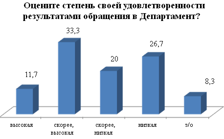 Следует сказать также и о том, что 26,7% заявили, что у них низкая степень удовлетворённости результатами обращения в Департамент. Данный результат, естественно, может быть вызван разными причинами (отчасти эта реакция может быт связана с наличием завышенных ожиданий), однако на него также следует обратить внимание при принятии конкретных управленческих решений.