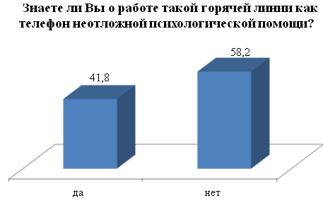 О работе горячей линии «Телефон неотложной психологической помощи» информировано меньшее число респондентов, по сравнению с результатом известности Московской службы психологической помощи населению г. Москвы. О работе «Телефона неотложной психологической помощи» знает 41,8% респондентов, что также является достаточно высоким результатом.