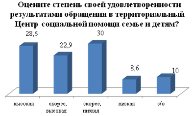 Низкую степень удовлетворённости обозначили только 8,6% респондентов, что является очевидно низким показателем. В большинстве случаев недовольство обращением в Центры социальной помощи семье и детям становится следствием завышенных ожиданий помощи от государства, желанием получить «все и сразу».