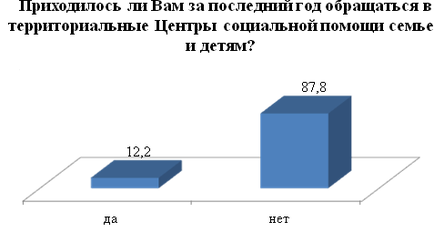 Диаграммы свидетельствуют, что чуть большая группа респондентов, по сравнению с теми, кто обращался в Департамент, обращались в территориальные Центры социальной помощи семье и детям. Согласно итоговым результатам 12,2% респондентов за последний год делали это.