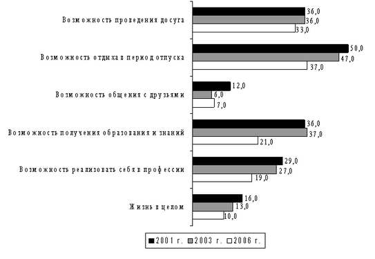 Обращает на себя внимание достаточно значимое снижение доли негативно оценивающих возможность получения необходимого образования и знаний – с 36%-37% в 2001-2003 гг. до 21% в 2006 г.(рис.1). 4Однако открытым остается вопрос о причинах этой динамики – то ли это результат привыкания к сложившейся ситуации, то ли действительно можно говорить о некотором улучшении ситуации в сфере образования. Нужно обратить внимание, что даже в младшей группе населения – до 30 лет – оценки возможности получения необходимых знаний и возможности реализовать себя в профессии достаточно низкие – только четверть россиян в возрасте до 30 лет оценивали эти возможности как хорошие. Такая ситуация должна привлечь внимание государства и проблема должна решаться, в том числе, с помощью государственной политики в сфере образования5.