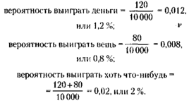 В последнем расчете мы суммируем в числителе дроби, так как число благоприятствующих шансов складывается из количества денежных и вещевых выигрышем.