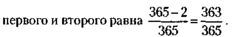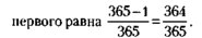 Теперь возьмем любого второго студента и найдем вероятность того, что его день рождения не совпадает с днем рождения первого студента. Число всех возможных случаев – возможных дней рождения в году – остается здесь, конечно, тем же – 365, а вот число интересующих нас случаев уменьшится на 1 – ведь тот день, когда праздники могут совпадать, надо выбросить. Итак, вероятность несовпадения дня рождения второго студента с днем рождения