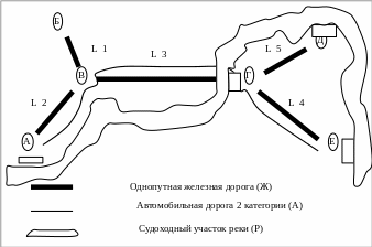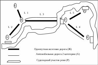 Схема транспортной сети региона состоит из 6 пунктов переработки грузов. Однопутная железная дорога соединяет все 6 пунктов. Автомобильная дорога 2 категории соединяет 4 пункта (А-В-Г-Е) следовательно вне сети автомобильных дорог 2 пункта (Б; Д). Судоходный участок реки соединяет 4 пункта (А-Г-Д-Е) и вне сети речного транспорта 2 пункта (В; Б). После предварительного анализа транспортной сети можно сказать, что требование магистрального вида транспорта выдерживает только один железнодорожный. Для автомобильного и речного необходимо новое строительство путей сообщения, т.е. трансформация сети по 1 критерию, после чего они тоже будут магистральными видами транспорта.