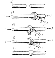 Подготовленные к сварке два стержня зажимают в захватах станка, центрируют и усилием Р, передаваемым подвижным захватом, сжимают друг с другом. После этого место стыка нагревают пламенем газокислородной многопламенной горелки, в патрубки которой К и А подают кислород и горючий газ. Для равномерного нагрева свариваемых частей и предотвращения оплавления поверхности металла горелку приводят в колебательное движение. Чтобы не допускать перегрева горелки, через патрубки В подводят и отводят охлаждающую воду.