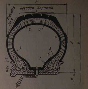 1 — каркас; 2 — брокер; 3 — протектор; 4 — боковина; 5 — камера; 6 — борт; 7 — ободная лента; 8 — обод; 9 — замочное кольцо (разрезное); 10 — бортовое кольцо (перазрезное); О — наружный диаметр; (I — посадочный диаметр; В — ширина профиля; Н — высота профиля