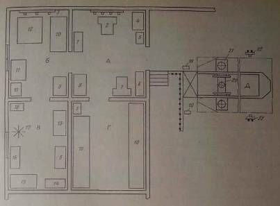 / — спредер; 2— стенд для демонтажа шин автобусов; 3—вешалка для камер (настенная); 4— ванна;.5—стол; 6—клеть для накачки шин; 7—стенд для демонтажа шин при замене камер; 8 — приспособление для очистки ободьев; 9 — балансировочный стенд; 10 — стеллаж; 11 — стенд для монтажа-демонтажа шин легковых автомобилей; 12 — площадка для монтажа шин автобусов; 13 — многопостовой электровулканизатор; 14 — шкаф; 15 — электронагревательный пресс для резинотехнических изделий; 16 — верстак; 17 — вешалка для камер (передвижная); 18 — шероховальный станок; 19 — воздухораздаточная колонка; 20 — канавный подъемник; 21 — приспособление для контроля углов установки колес автобусов; 22 — гайковерт.