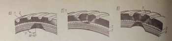 Причиной некачественного ремонта бескамерных шин может быть нахождение в отверстии талька, которым на заводе припудривают внутреннюю полость шины. Поэтому желательно прокол прочистить круглым тонким напильником (надфилем) или в крайнем случае смочить несколькими каплями бензина. Проколы (пробои) более 10 мм ремонтируют только после демонтажа шины с обода. Специальным приспособлением в прокол изнутри покрышки вводят грибок из сырой резины (см. рис. 11.12, а, в), затем вулканизируют. Аналогично ремонтируют обычные камерные покрышки.