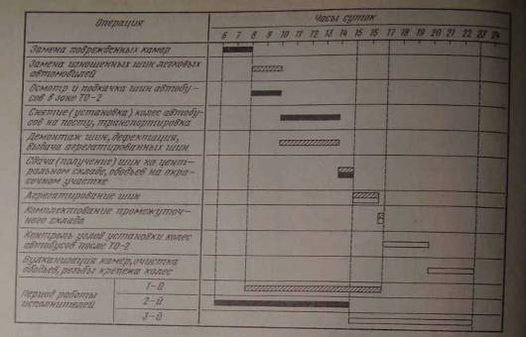 Метод предварительного агрегатирования шин требует четкого взаимодействия участка с другими производственными подразделениями: группой учета шин, складом шин, окрасочным участком, зоной ТО-2. Поэтому технологический процесс разделен на ряд основных операций с закреплением их (с учетом трудоемкостей) по исполнителям, рабочим местам и времени выполнения. Для удобства пользования технологический процесс можно представить в виде линейного графика (рис. 1.6.16). При этом упрощается оценка своевременности качества выполняемых работ каждым исполнителем. Исполнители oпeрации могут друг друга заменят:, они же отвечают за качество и объем всего требуемого перечня шинных работ, включая установку колес на автомобиль. При выполнении этой операции водителем часто не соблюдаются правила комплектования автомобиля шинами, не выдерживаются нормативы на затяжку крепежа, что приводит к снижению безопасности, а у бездисковых колес к возникновению торцевого биения.