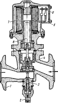 Соленоидный вентиль (рис. 8.4) состоит из клапана 4, помещенного в корпусе /, и электромагнитной катушки (соленоида) 7. При прохождении электрического тока в катушке возникает магнитное поле и якорь 8, втягиваясь в катушку, полностью открывает клапан для прохода хладагента. При прекращении электропитания якорь опускается вниз и клапан закрывает проходной канал вентиля.