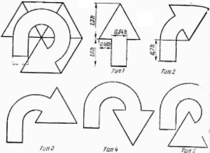 Горизонтальное расположение стрелки целесообразно применять на знаках, устанавливаемых на простых пересечениях в одном уровне (пересечение дорог под прямым иди близким к нему углом), а расположение под углом 45° - на знаках, устанавливаемых перед пересечениями в разных уровнях или перед перекрестками, где дороги пересекаются не под прямым углом. В последнем случае на знаках 6.9.2 и 6.10.1 в зависимости от планировки пересечения или реализуемой схемы движения могут быть использованы стрелки типов 2-5, общий принцип построения которых дан на рис. 13.
