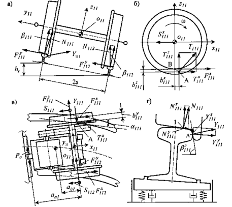 У розрахунковій схемі, рис.1, прийняті наступні позначення систем координат для відповідних мас т і моментів інерції J: i, j-ой колісної пари про у, Ху, у у, zy; i-ї рами вагона of, xf, yf, z*; кузови про, х, у, z .