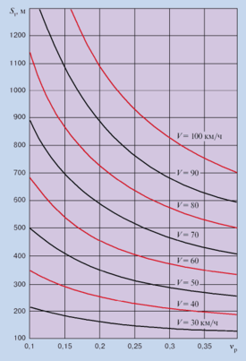 Рис.20. Залежність гальмівного шляху вантажних потягів Sт від гальмівного коефіцієнта 'р і швидкості V при екстреному гальмуванні на майданчику