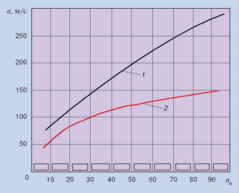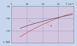 Рис.18. Залежність повздовжніх зусиль від швидкості потягу перед гальмуванням при колодках: 1 — композиційних; 2 — чавунних