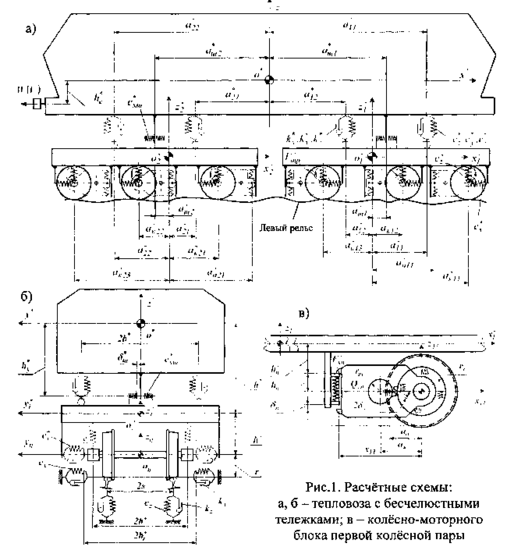 Розробка узагальненої математичної моделі просторових коливань вантажного шестиосного тепловоза, а також опису методики комп'ютерного моделювання. Розрахункова схема локомотива і схема дії сил в системі колісна пара - шлях стосовно колісно-моторного блоку першої колісної пари показані відповідно на рис.1 і 2. Просторові коливання екіпажу тепловоза ТЭ116 визначаються 78 узагальненими координатами.