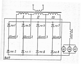 Силовая схема ВИП позволяет реализовать четырехзонное регулирование выпрямленного напряжения при трех секциях вторичной обмотки тягового трансформатора.