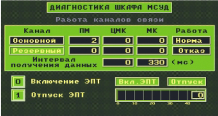 Далее необходимо произвести выключение и включение шкафа МСУД1, при этом происходит запуск технологических программ в ЦМК, выбранном МПК и БИ1. При установлении связи шкафа МСУД1 с блоком БИ1 дважды нажать клавишу "МСУД" и проследить на выбранном кадре работу резервного и основного каналов связи. При нормальной работе обоих каналов можно перейти к проверке звуковой сигнализации. Для этого нажать клавишу "выбор кадра" и клавишу "7", при этом должно прозвучать звуковое сообщение "Задана рекуперация" или "Задана тяга". После произведенных вышеперечисленных проверок аппаратура МСУД считается годной к эксплуатации.