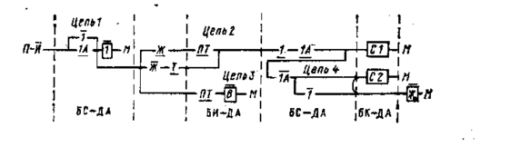 На каждой сигнальной установке применены дешифраторы типа ДА, блоки которых показаны в раскрытом виде и увязаны с кодирующими цепями (рис. 2). В эти цепи включены трансмиттеры КПТШ-5 и КПТШ-7 и трансмиттерные реле Т. На выходах блока БС-ДА дешифратора включены сигнальные реле Ж и 3, управляющие огнями светофора и формирующие цепи кодирования. Показано также включение сигнального реле Ж1, которое является повторителем реле Ж и счетчика 1. С помощью реле Ж1 ускоряется включение кодов АЛС в рельсовую цепь с момента занятия ее поездом.