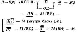 При приеме кода КЖ на сигнальной установке 5 в режиме этого кода работает реле И. Импульсная работа реле И расшифровывается дешифратором, и через его выход 42 (БС) срабатывает реле Ж. Через выход . 71 (БС) и фронтовой контакт реле Ж срабатывает реле Ж/, после чего срабатывают повторители реле Ж2 и ЖЗ. По цепи, проходящей через фронтовой контакт реле Ж2 тыловой контакт реле 3, на светофоре 5 включается лампа желтого огня. После включения желтого огня на светофоре 5 образуется цепь кодирования кодом Ж рельсовой цепи 7П: