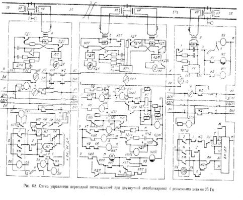 - При горении на светофоре Н двух желтых огней в рельсовую цепь со станции посылается код Ж. У светофора 1 через дешифратор возбуждаются реле Ж, Ж1, Ж2, Ж3 и З. Фронтовыми контактами реле Ж1 и З замыкается цепь мигающего реле М. Реле М работает с частотой около 40 периодов в минуту. Для получения замедления на отпускание якоря реле М одна из его обмоток шунтируется собственным контактом. Благодаря этому через конденсаторный дешифратор включается реле КМ, которое и контролирует мигание. Реле М, переключая контакт в цепи ламп светофора, включает последовательно или низкоомную обмотку реле РО, и лампа загорается, или высокоомную обмотку реле РО, и лампа гаснет.