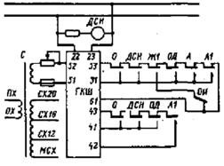 При отсутствии основного питания обесточивается реле At тыловым контактом которого замыкается перемычка между выводами 53-31 ГКШ. В линию посылается контрольный код, состоящий из импульсов и интервалов длительностью 1 с. Отсутствие резервного питания фиксируется выключением реле А1, через тыловые контакты которого замыкаются перемычки между выводами 53-31 и 43-42. В линию посылается контрольный код, состоящий из импульсов длительностью 1 с и интервалов 0,3 с. В случае неисправности цепи двойного снижения напряжения обесточивается реле ДСН. Его тыловыми контактами замыкаются перемычки между выводами 53-31 и 43-41. В линию посылается такой же контрольный код, как и при перегорании нити лампы красного огня: импульс 0,3 с, интервал 1 с. Цепь ДСН контролируется при свободном и занятом состояниях блок-участка.