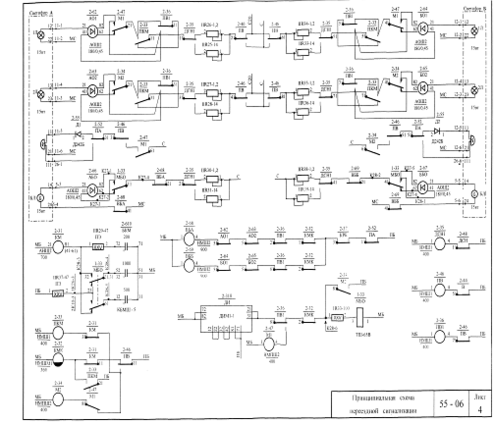 Схема светофорной сигнализации (рис 6). Огни переездных светофоров и звонки включают включающее реле В и его повторитель реле ПВ. Мигающая сигнализация переездных светофоров создается с помощью датчика импульсов ДИМ 1-1 (работающего в постоянном режиме) и комплекта мигающих реле М, КМ, КМК и ПКМ.