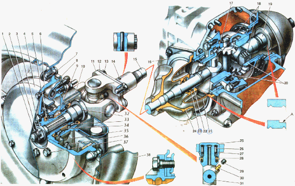1 — гайка; 2 — шплинт 3 — упорная шайба; 4 — колпак декоративный; 5 — манжета; 6 — тормозной барабан; 7 — гайка крепления колеса; 8 — щит тормоза; 9 — ступица; 10 — рычаг задней подвески; 11 — вилка кардана ведущая; 12 — фланец; 13 — болт; 14 — штифт стопорный; 15 — полуось; 16 — крышка; 17 — палец полуоси; 18 — сухарь полуоси; 19— корпус манжеты правый; 20 — шестерня полуоси; 21— чехол; 22 — корпус левый; 23 — манжета; 24 — грязеотражатель; 25 — подшипник крестовины кардана; 26 — иголки подшипника; 27 — стопорное кольцо; 28 — уплотнитель; 29 — колпачок; 30 — пресс-масленка; 31 — крестовины; 32 ,— ведомая вилка; 33 — подшипник ступицы; 34 — распорная втулка; 35 — корпус подшипников; 36 — болт; 37 — болт крепления тормозного барабана; 38 — диск колеса; А — проточка на левом корпусе 22.