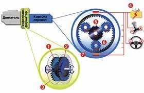 Применяемые в таких "автоматах" планетарные коробки передач получили свое название за шестерни-сателлиты, вращающиеся вокруг центральной (солнечной) шестерни, подобно планетам. Рассказ о принципе работы таких систем занял бы слишком много места. Скажем лишь, что их использование в автоматической трансмиссии обусловлено крайней простотой изменения передаточного отношения: достаточно лишь притормозить тот или иной вращающийся элемент или соединить их между собой посредством специальной фрикционной муфты. Эти процессы относительно легко поддаются автоматизации.