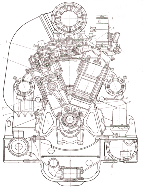 Рис. 3. Дизель-генератор 1А-9ДГ. 1-втулка цилиндра, 2-поршень, 3-крышка цилиндра, 4-лоток, 5-объединеный регулятор, 6-топливный насос, 7-выпускной коллектор, 8-блок цилиндров, 9-шатуны, 10-охладитель масла.