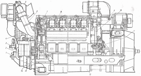 Рис. 4. Дизель-генератор 1А-9ДГ. Продольный разрез. 1-масляный насос.2-фильтр грубой очистки масла, 3-водяной насос, 4-охладитель надувочного воздуха, 5-турбокомпрессор, 6-выпускные трубы, 7-форсунка, 8-механизм управления топливными насосами, 9-валопровод вспомогательных агрегатов, 10-привод распределительного вала, 11-муфта, 12-рама, 13-демпфер, 14-привод насосов.