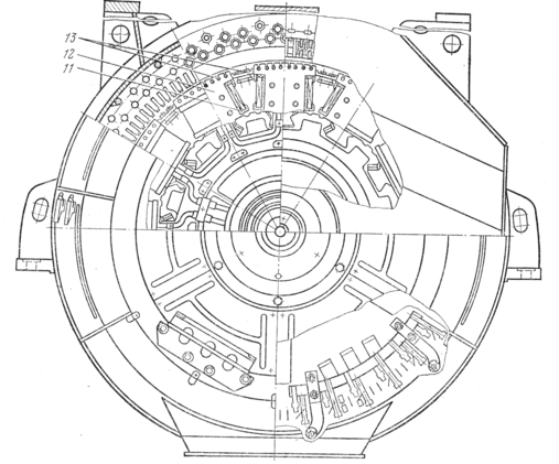 Рис. 5. Поперечный разрез тягового синхронного генератора ГС-501А 11-катушка полюса ротора.12-полюс ротора, 13-демпферная обмотка.