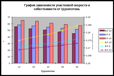 По результатам расчетов строим график зависимости участковой скорости и себестоимости для грузопотока (рис 3.1) Гн=12,16,18,20,22,24,26,28,30.